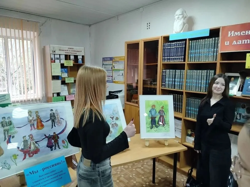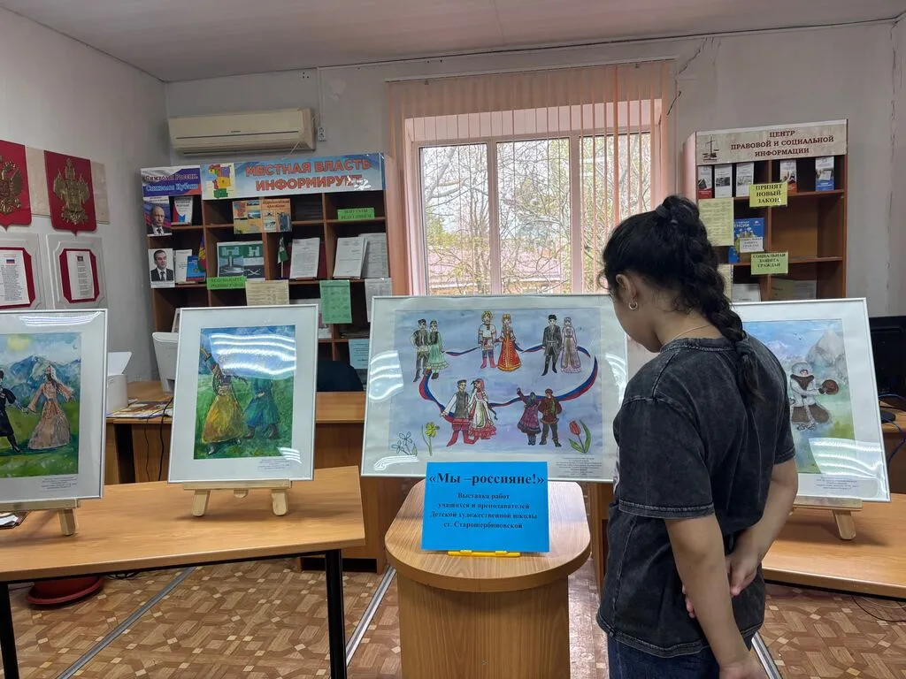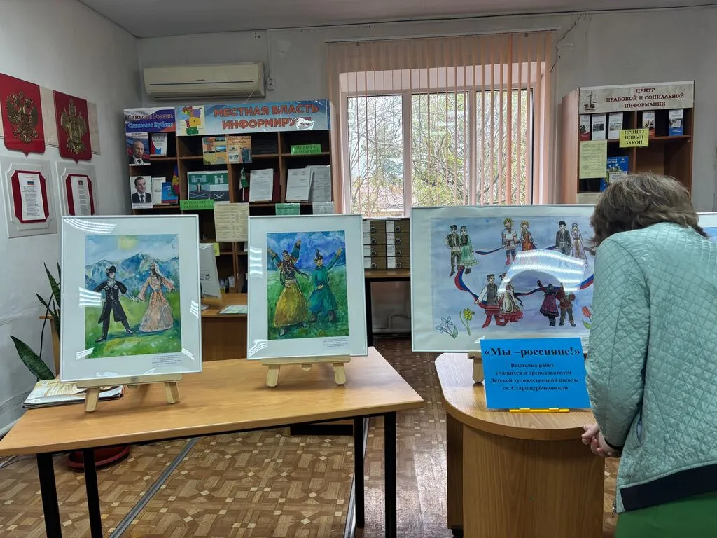 Особый интерес у присутствующих вызвала выставка работ учащихся и преподавателей Мудрак Киры Константиновны и Солоповой Вероники Владимировны Детской художественной школы ст. Старощербиновской «Мы – россияне!».